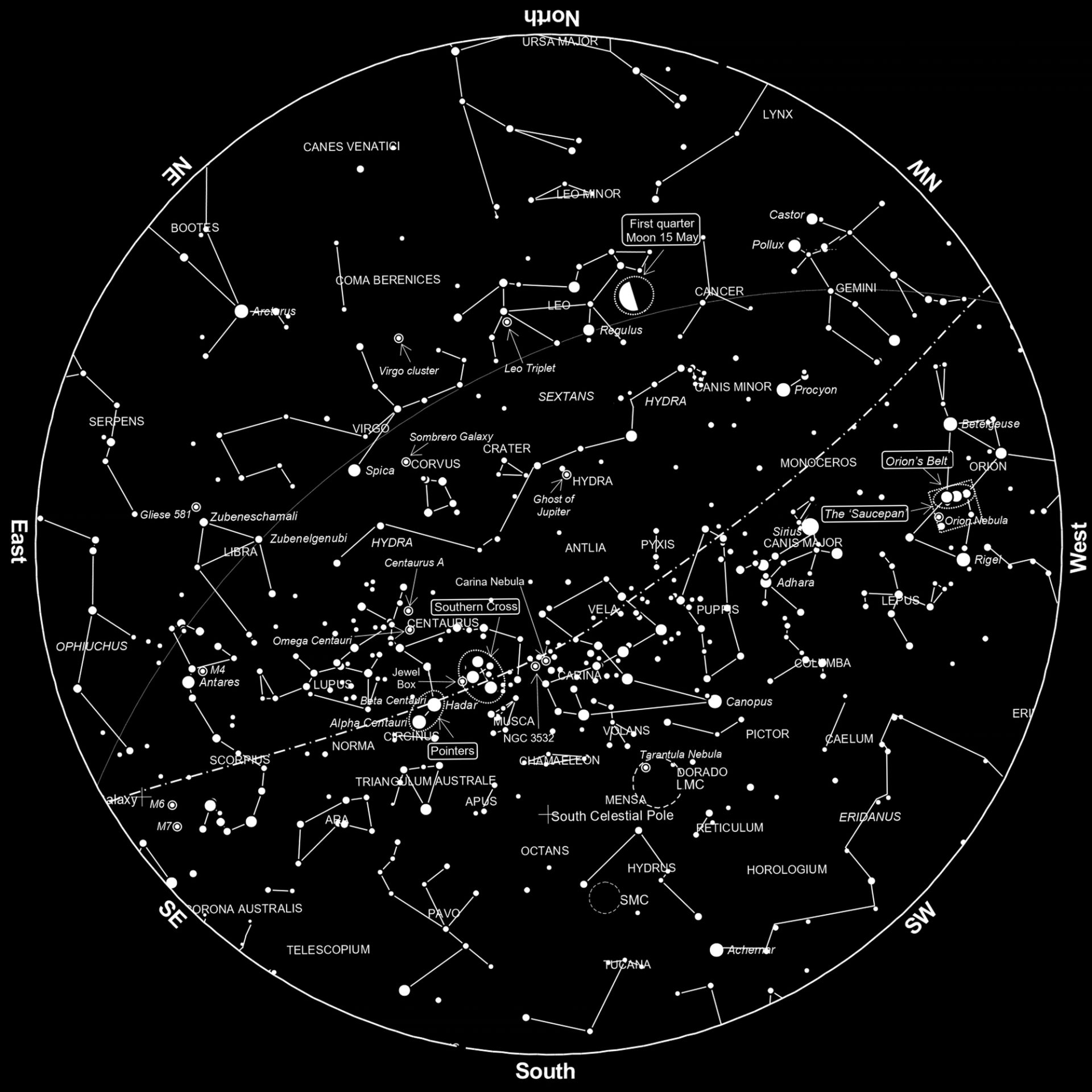 Crux or the Southern Cross is the smallest of all 88 western constellations and consists of four bright stars. Along with the nearby pointers of Alpha and Beta Centauri, Crux can be used to find south. Draw an imaginary line from the top of the cross shape through the bottom and across the sky. Midway between the pointers draw a line perpendicular to the line that joins them. Where these two longer lines intersect is close to the southern celestial pole. From this point drop to the horizon to locate south. This technique works at any time of the night, any time of the year. The superb open cluster NGC 4755 (Jewel Box) appears very close to the second brightest star, Beta Crucis.
